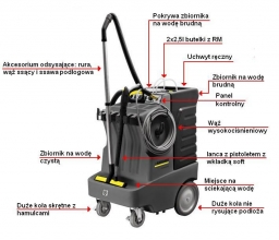 Następnie, przy użyciu odkurzacza skutecznie odsysa się brudną wodę lub pianę z czyszczonej powierzchni. Pomieszczeniejest dostępne od razu po przeprowadzeniu czyszczenia. Jedną z ważnych cech tego wielofunkcyjnego urządzenia jest możliwość jego równoczesnego użytkowania przez dwie osoby, co pozwala skrócić czas sprzątania. AP 100/50 doskonale sprawdza się również do utrzymania czystości w szatniach i na basenach.